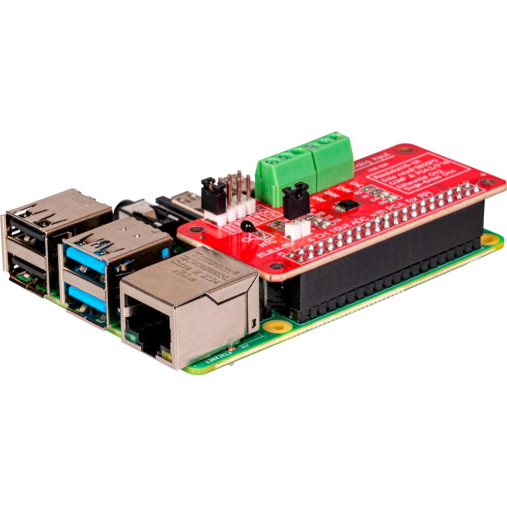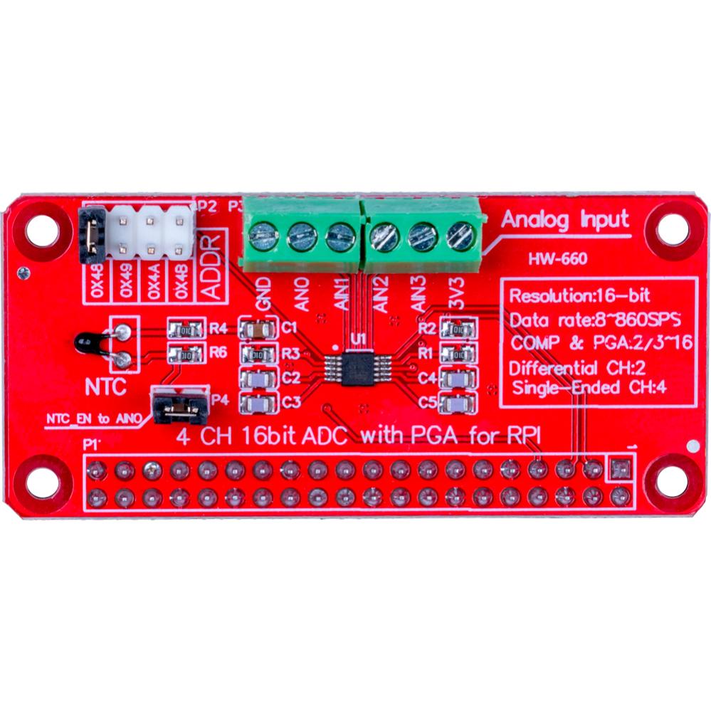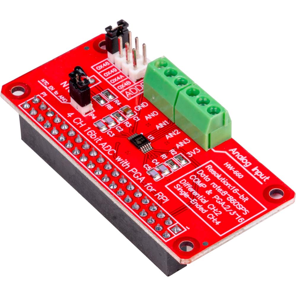 ADC01 är en 4-kanals ADC-modul (analog-till-digital omvandlare) för användning med Raspberry Pi. Bygger på 16-bitars ADC-kretsen ADS1115 som ger högupplöst mätning av analoga signaler. Ansluts direkt till GPIO-stiftlisten. Modulen är lämplig för projekt där mätning av analoga signaler behövs, till exempel temperaturgivare, ljus- eller potentiometersensorer. Möjlighet att ansluta upp till fyra separata analoga ingångar för sensorer eller andra analoga enheter. I2C-adressen är initialt satt till 0x48 men kan konfigureras till 0x49, 0x4A eller 0x4B med hjälp av bygel.