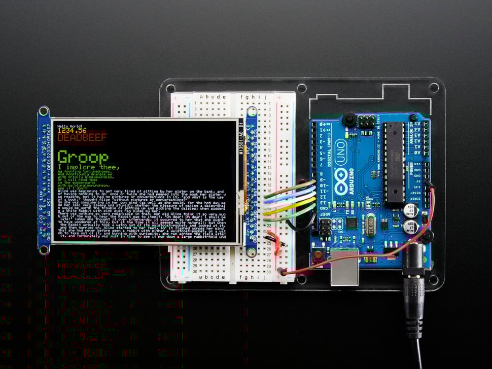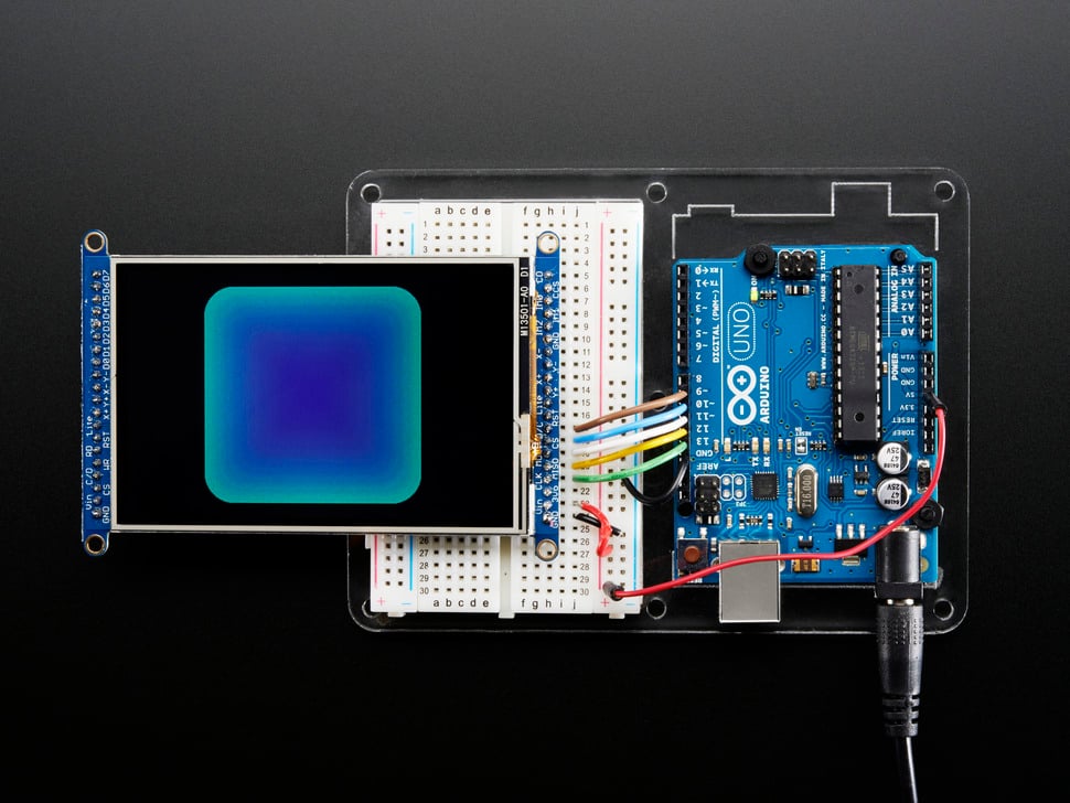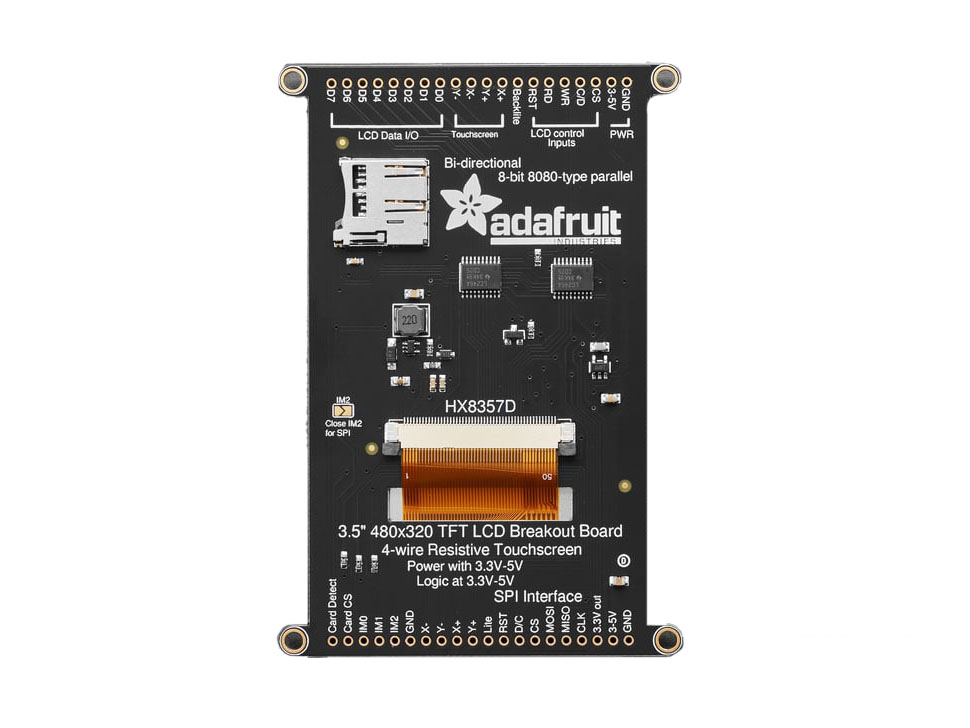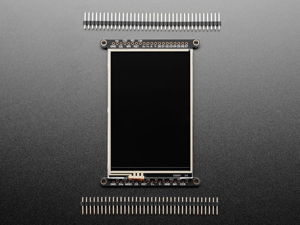 3.5” TFT-skärm. Ljusstark färgskärm (6 vita LED-bakgrundsbelysning). Med 480x320 pixlar och individuell RGB-pixelkontroll blir det mycket högre upplösning jämfört med än en svartvit 128x64-skärm och dubbelt så hög upplösning en 2,8" TFT-skärm. Skärmen är en resistiv pekskärm. Inbyggd styrenhet med RAM-buffert, så att mikrokontrollern knappt belastas. Displayen kan användas i två lägen: 8-bitars eller SPI. I 8-bitarsläget behövs 8 anslutningar och 4 eller 5 kontrollinjer. För SPI-läget behövs bara 5 anslutningar. SPI är dock långsammare än 8-bitarsläget. För pekskärmen används 4 anslutningar (2 digitala, 2 analoga).