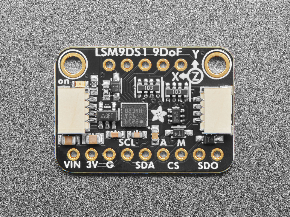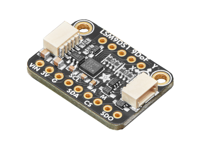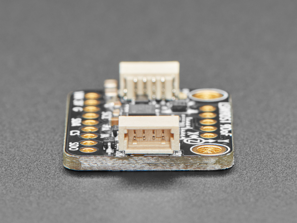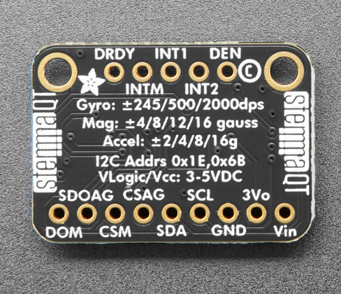 Kortet är Qwiic-kompatibelt för snabb anslutning via I2C utan lödning. Kan även användas för kopplingsdäck med den medföljande stiftlisten (ej förmonterad). Sensorn kan mäta gravitation, rörelse i tre dimensioner och magnetfält för att identifiera magnetisk nord, medan gyroskopet mäter rotation och vridning.