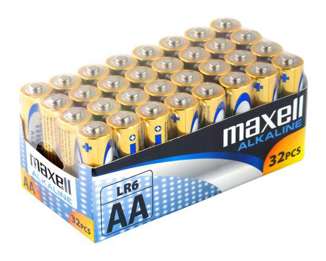 Maxell AA 32-pack. Alkaliska batterier avsedda för att ge stabil effekt vid både låg- och mellanstor belastning – exempelvis fjärrkontroller, trådlösa tangentbord/möss, Bluetooth-headset, larmsensorer, blodtrycksmätare etc.