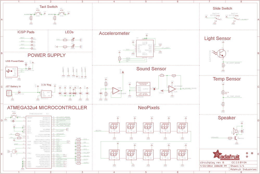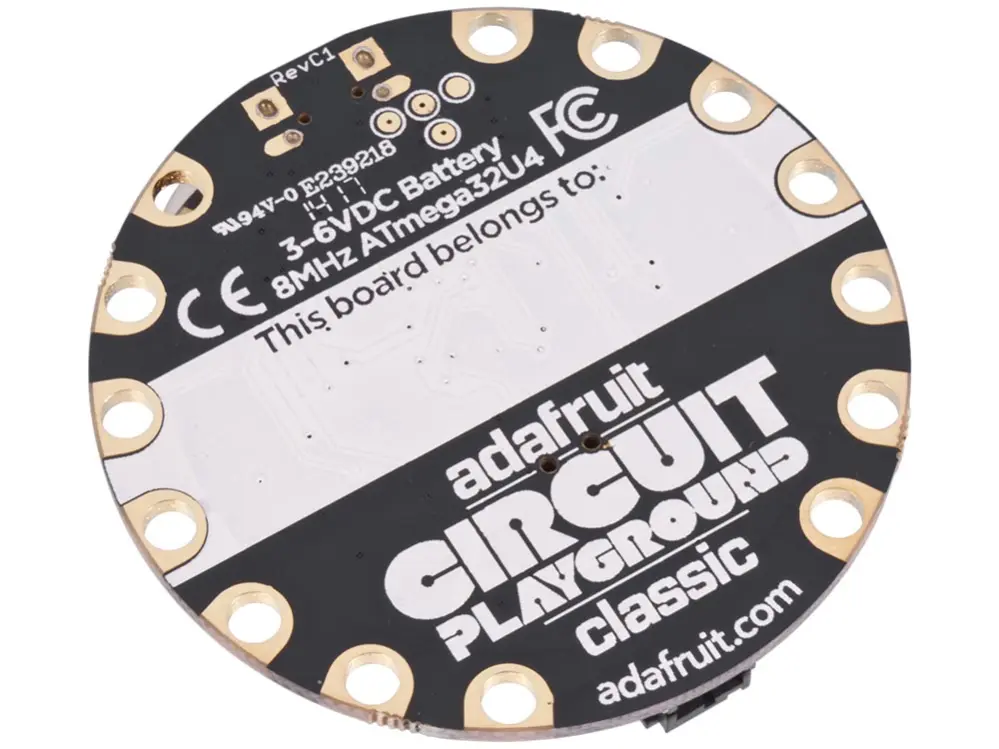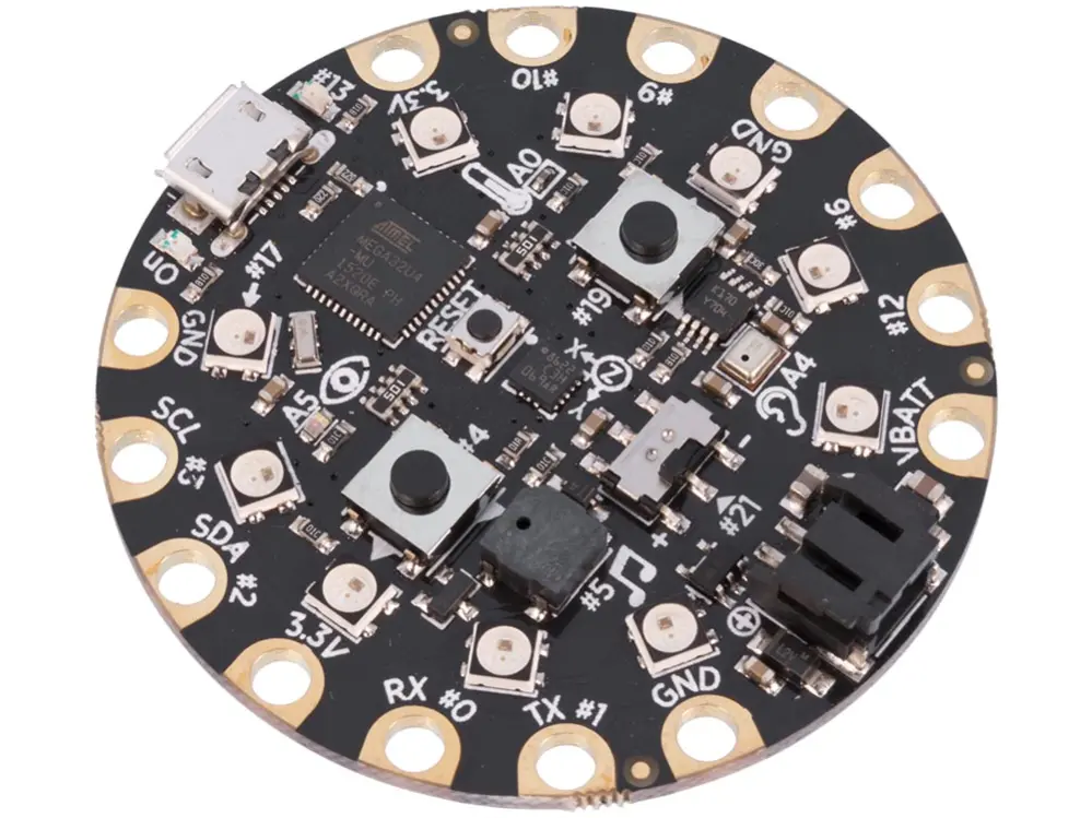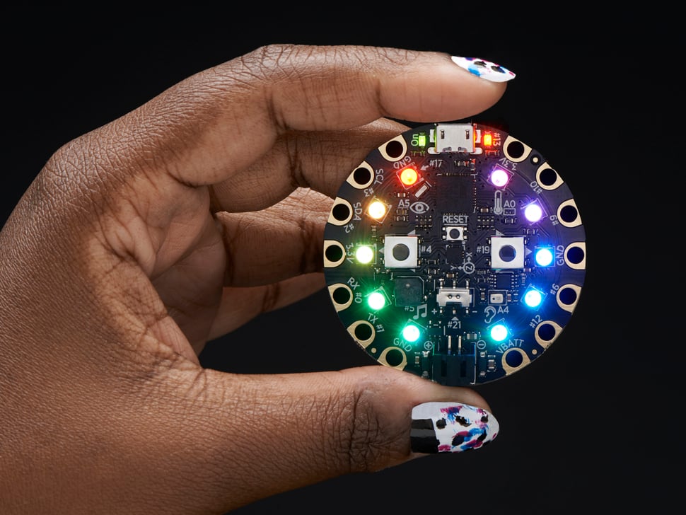 Circuit Playground features an ATmega32u4 processor, just like our popular Flora. The board's also round and has alligator-clip pads around it so you don't have to solder or sew to make it work. You can power it from USB, a AAA battery pack, or with a Lipoly battery (for advanced users). Just program your code into the board then take it on the go!