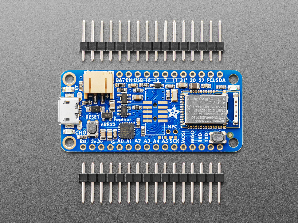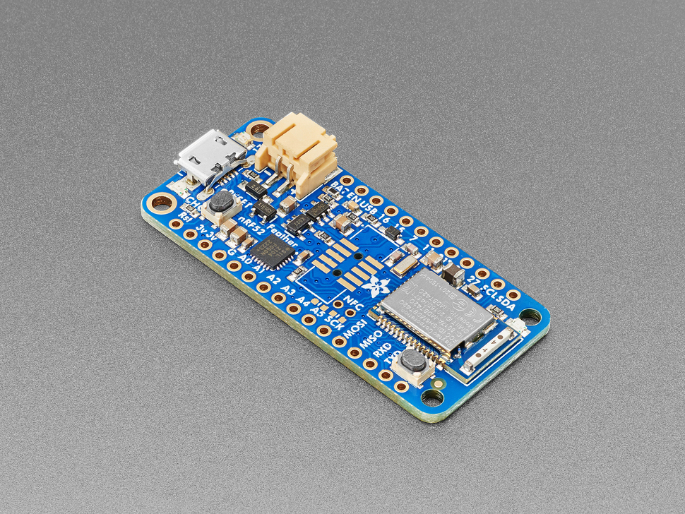 Adafruit Feather nRF52 Bluefruit är ett komplett utvecklingskort för Bluetooth Low Energy byggt kring nRF52832 från Nordic Semiconductor. Kortet är arduinokompatibelt, har inbyggd USB och som vanligt i Feather-serien inbyggd kontakt och laddkrets för LiPo-batterier.