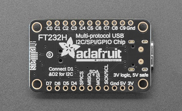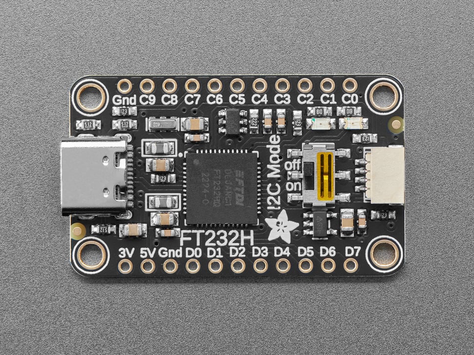 Adafruit FT232H Breakout är ett kompakt utvecklingskort som möjliggör direkt kommunikation mellan en dator och externa sensorer, displayer eller andra perifera enheter. Stöd för flera vanliga seriella gränssnitt utan behov av en separat mikrokontroller. Kortet baseras på FTDI:s FT232H-chip med en Multi-Protocol Synchronous Serial Engine (MPSSE) som ger stöd för SPI, I2C, seriell UART och JTAG, samt ett antal digitala GPIO-utgångar och ingångar som kan läsa och skriva logiska nivåer för att t ex blinka LED-indikatorer eller läsa enkla omkopplare. Detta är den uppdaterade versionen med USB-C-kontakt och en Qwiic-anslutning. Det går att enkelt integrera valfri Qwiic-modul genom plug & play-funktionalitet. Kortet har även en I2C-brytare som gör det smidigt att skifta I2C-gränssnitt och en +3 V-matningsutgång som kan leverera upp till 500 mA till anslutna moduler. FT232H-breakouten har ingen inbyggd firmware som måste hanteras, vilket innebär att datorn direkt kan använda protokollen via gemensamma Python-bibliotek (Mac/Windows/Linux) inklusive CircuitPython-stöd, det för snabb prototypning och testning. Den uppdaterade versionen i övrigt helt bakåtkompatibel med tidigare variant vad gäller fysisk layout och pinout och monteringshål. Det underlättar återanvändning i befintliga konstruktioner. Kortets små yttermått gör det lämpligt i både bänkprototyper och integrerade system där utrymmet är begränsat.