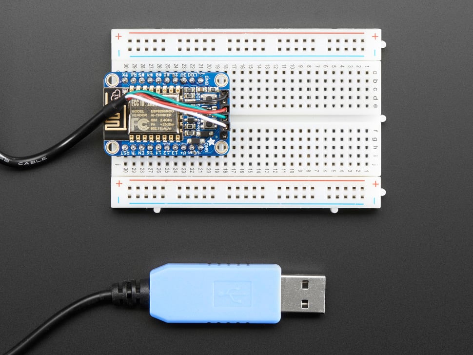 One breakout at the end has an "FTDI" pinout so you can plug in an FTDI or console cable to upload software and read/write debugging information via the UART. When you're done with your coding, remove the cable, and this little module can be embeded into your project box.
