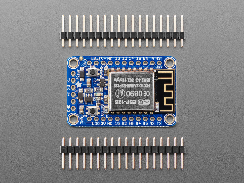 The Adafruit HUZZAH ESP8266 breakout is what we designed to make working with this chip super easy and a lot of fun. We took a certified module with an onboard antenna, and plenty of pins, and soldered it onto our designed breakout PCBs. We added in: