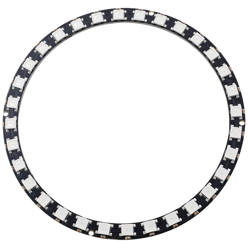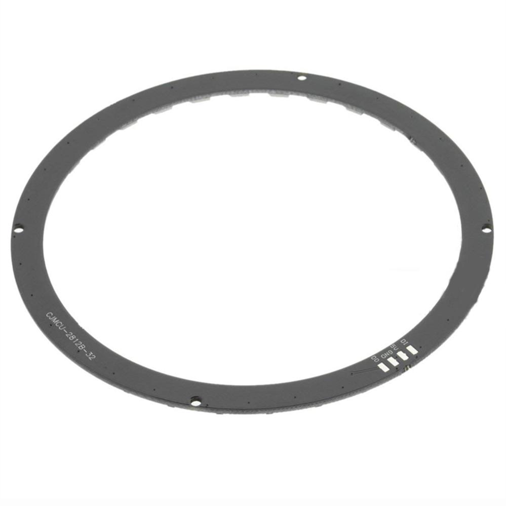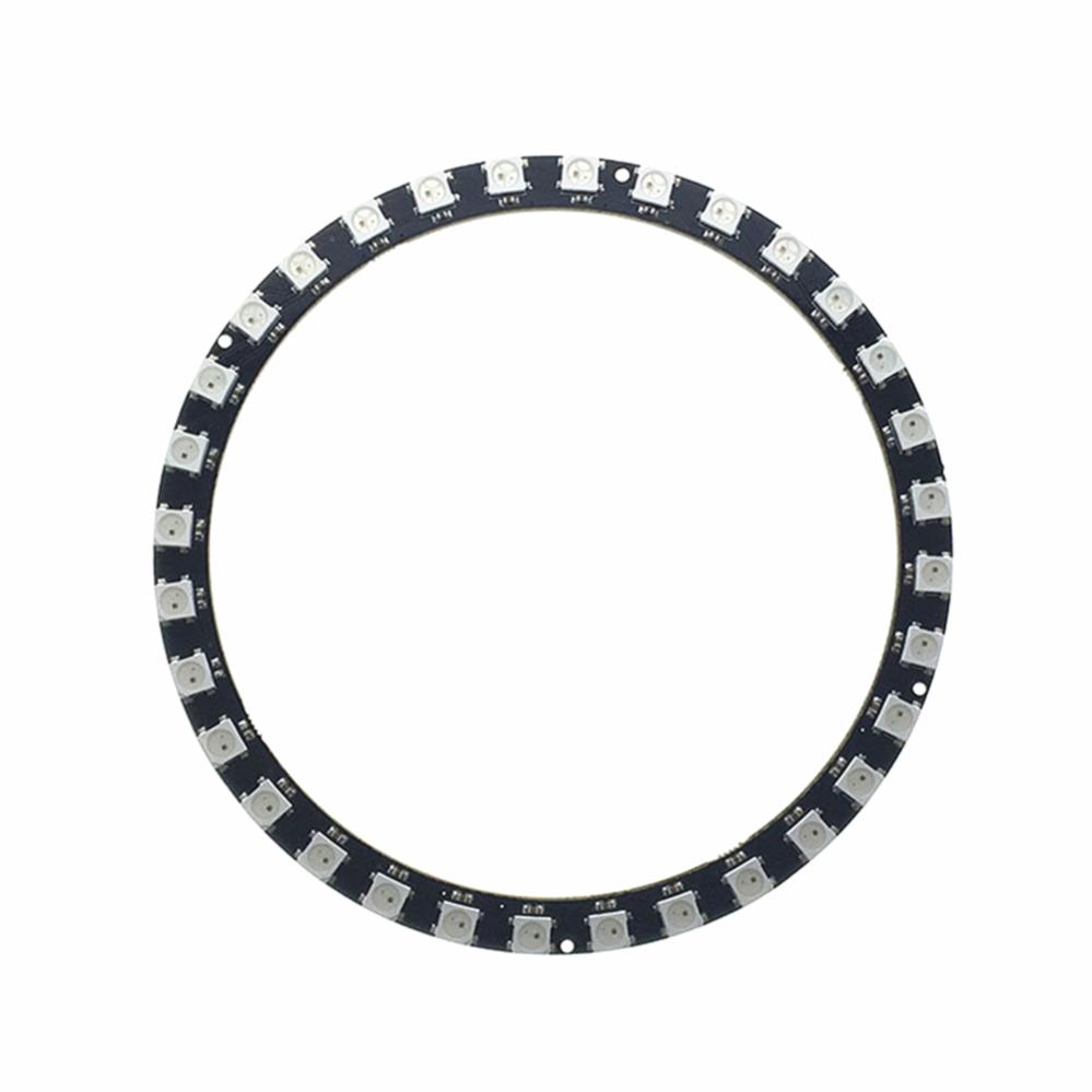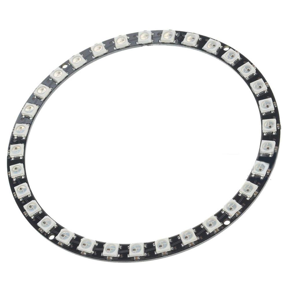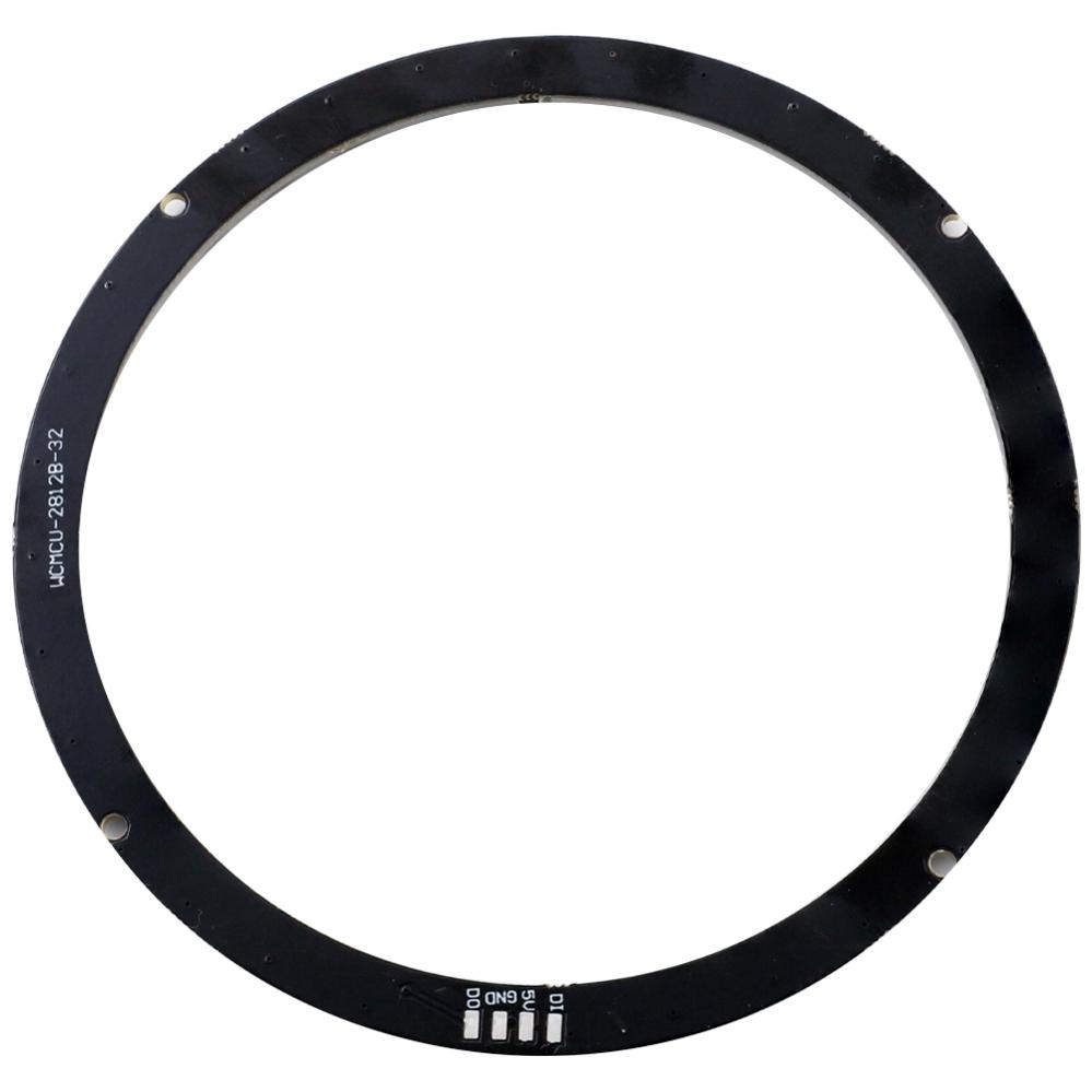 Neopixel-kompatibel RGB LED-ring med 32 individuellt styrbara RGB-lysdioder. Varje lysdiod har en inbyggd seriekontroller (WS2812B), på så sätt styrs alla LED via en enkel datalinje. Det möjliggör exakt färgstyrning via en enda datalinje från en mikrokontroller. Du kan enkelt skapa avancerade ljusmönster och färgövergångar. Ringen har en diameter på 104 mm och är lämplig för projekt som t.ex. indikatorer, visuella effekter eller dekorativa installationer. Ringmodulen kan även kedjekopplas, flera ringmoduler kopplas efter varandra på samma datalinje.