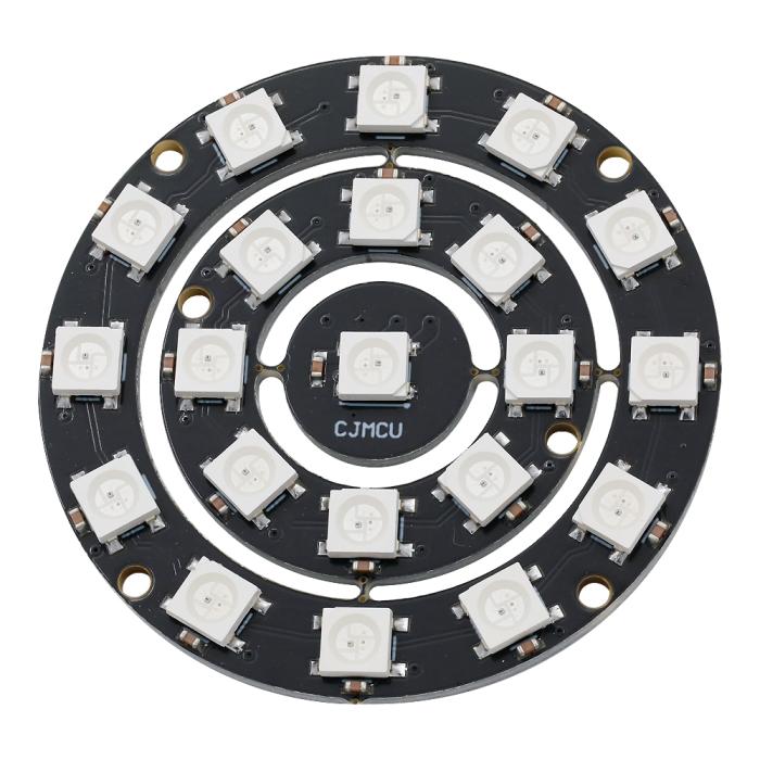 Neopixel-kompatibel RGB LED-ring med 21 individuellt styrbara RGB-lysdioder. Varje lysdiod har en inbyggd seriekontroller (WS2812B), på så sätt styrs alla LED via en enkel datalinje. Det möjliggör exakt färgstyrning via en enda datalinje från en mikrokontroller. Du kan enkelt skapa avancerade ljusmönster och färgövergångar. Ringen har en diameter på 58 mm och är lämplig för projekt som t.ex. indikatorer, visuella effekter eller dekorativa installationer. Ringmodulen kan även kedjekopplas, flera ringmoduler kopplas efter varandra på samma datalinje.