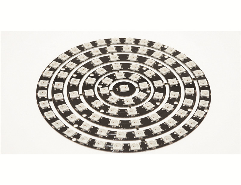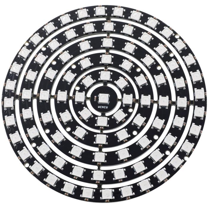 Neopixel-kompatibel RGB LED-ring med 93 individuellt styrbara RGB-lysdioder. Varje lysdiod har en inbyggd seriekontroller (WS2812B), på så sätt styrs alla LED via en enkel datalinje. Det möjliggör exakt färgstyrning via en enda datalinje från en mikrokontroller. Du kan enkelt skapa avancerade ljusmönster och färgövergångar. Ringen har en diameter på 125 mm och är lämplig för projekt som t.ex. indikatorer, visuella effekter eller dekorativa installationer. Ringmodulen kan även kedjekopplas, flera ringmoduler kopplas efter varandra på samma datalinje.