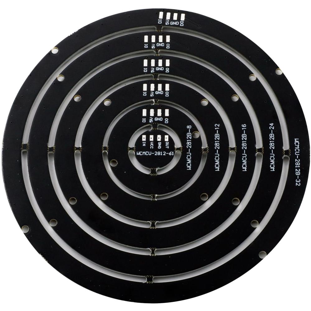 LED-ringen kan användas med alla 93 LEDs, alternativt kan den enkelt delas till 5 ringar plus en sigel-LED. Anslutning sker via tydligt märkta lödpads för matning, jord och datasignal in/ut.