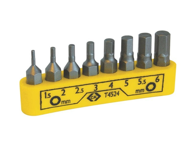 Sats med åtta olika hex-bits, i storlekarna 1.5, 2, 2.5, 3, 4, 5, 5.5 och 6 mm. Kallas också insex, för skruv med invändig hexagonal fattning. Frästa i härdat S2 CrMo-stål med precision som ger ett säkert grepp, för bästa vridmoment och minimalt slitage på skallens mönster. Vanligt 1/4"-fäste som passar med skruvdragare, bitsmejslar och spärrhandtag.