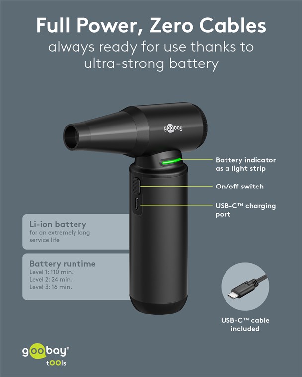 Air Duster Superior är en laddningsbar kraftfull blåspistol för rengöring och uppblåsning där traditionell tryckluft annars används. Tack vare borstlös motor, uppladdningsbart Li-jon-batteri och mycket höga varvtal uppnås en koncentrerad stark luftström lämplig för effektiv rengöring av tangentbord, datorchassin, fordons interiör samt uppblåsning av luftmadrasser och liknande. Laddas med USB laddare (medföljer ej).