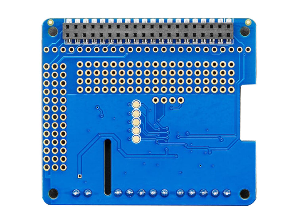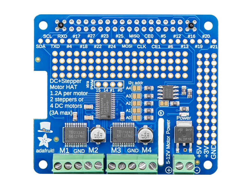 Motordrivarkort för Raspberry Pi som kan användas för att styra antingen 4st vanliga DC-motorer eller 2st stegmotorer med hastighetskontroll via PWM. Då Raspberry Pi har begränsade möjligheter till PWM-styrning, hanteras det internt i drivaren. Hastighet och riktning styrs istället via I2C, vilket gör att flera kort (upp till 32st) kan anslutas till samma I2C-portar. Själva drivningen av motorerna hanteras av TB6612 FET-transistorer som har en maximal kapacitet på 1.2A per kanal (max 3A tillfälligt). Drivaren kan användas med motorspänningar från 4.5 till 13.5VDC. Anslutningar för motorer och matningsspänning via skruvterminaler.