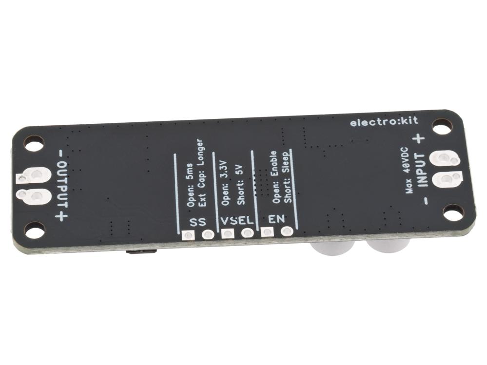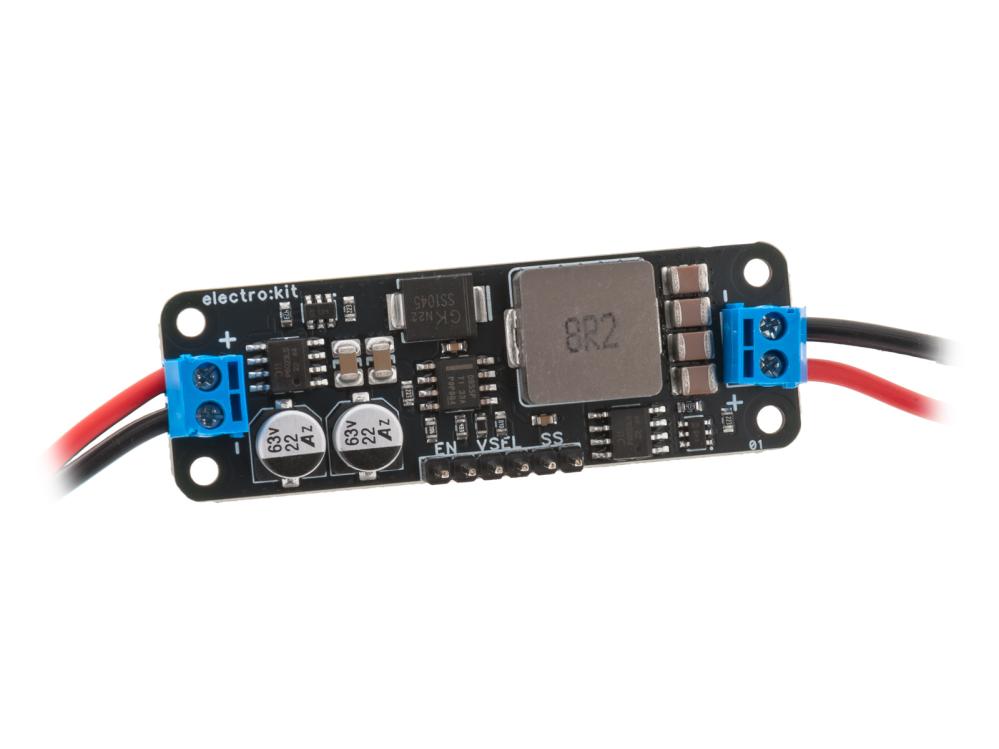 Kompakt och kraftfull DC/DC-omvandlare för extra brett spänningsområde. Utvecklad och tillverkad av Electrokit. Bygger på Texas Instruments krets LMR14050. Modulen klarar av att omvandla en inspänning från 4 - 40 VDC till en lägre spänning. Utgången lämnar en fast utspänning på 3.3V (VSEL öppen) eller 5V (VSEL byglad). Observera att inspänningen alltid måste vara någon volt högre än önskad utspänning för att regleringen ska fungera normalt (step-down). Maximalt strömuttag är begränsat till 5A. Regulatorn är skyddad mot fel polaritet och backström med externa kretsar. Internt är regulatorn skyddad mot överbelastning, för hög temperatur och överspänning. Övriga funktioner på kortet är en precis Enable-ingång som även kan skydda mot underspänning (UVLO) samt en justerbar mjukstart (kräver en extern kondensator). Kortet levereras med omonterade kontakter. Två skruvplintar och en stiftlist medföljer, behöver lödas fast på kortet.