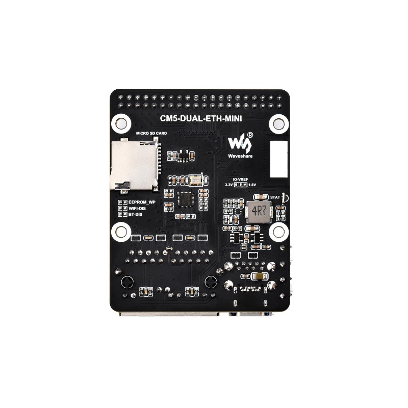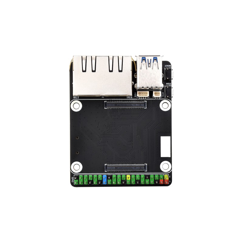 Funktioner och gränssnitt på kortet inkluderar standardiserad CM5-sockel för enkel installation av modulen, dubbel Gigabit Ethernet-anslutning med en port via modulens originalnätverksgränssnitt och en via PCIe-anslutning. En USB 3.2 Gen1-port för hög dataöverföring till kringutrustning, samt en 40-pin GPIO header för expansion med kompatibla HAT-enheter. Kortet har även power-strömbrytare för system på/av, BOOT-knapp för firmware-hantering, indikator-LED för driftstatus.