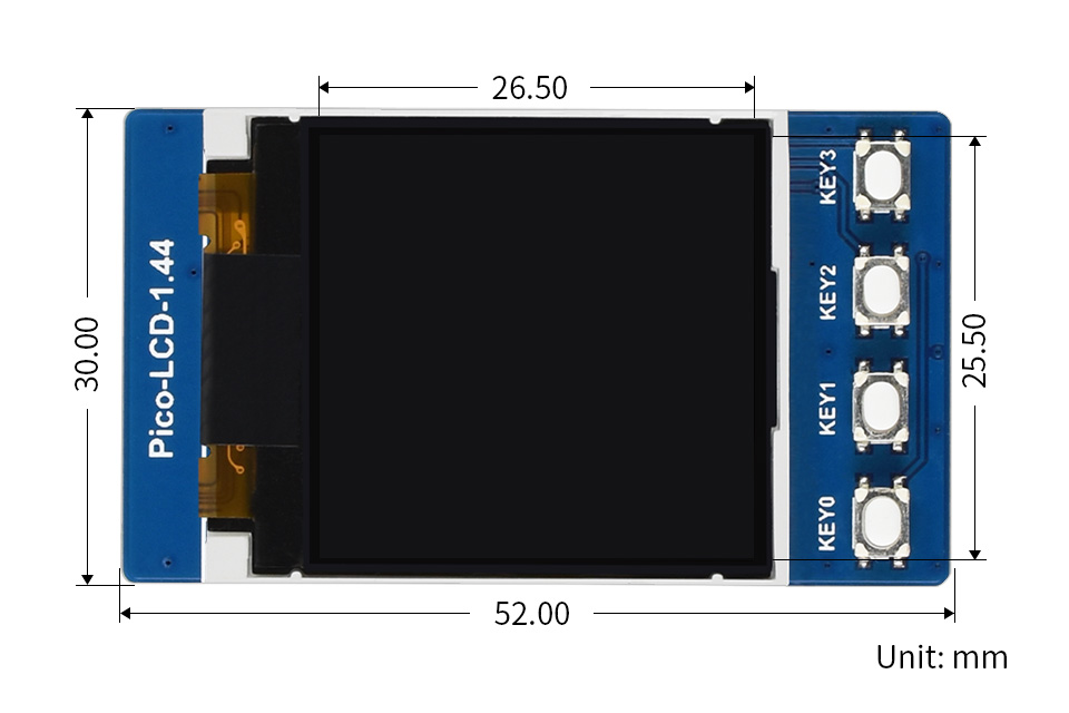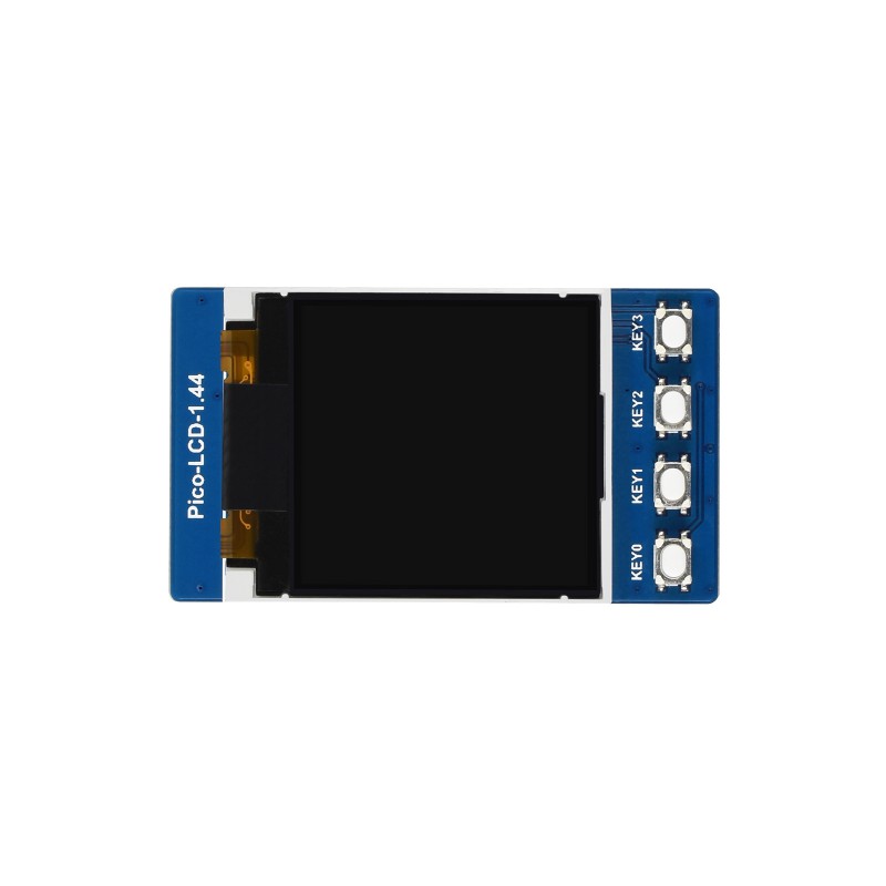 Pico-LCD-1.44 is a display module developed for Raspberry Pi Pico. Intended for projects where visual feedback and user interaction are required. The module connects directly to the Pico via pin headers and uses an SPI interface.