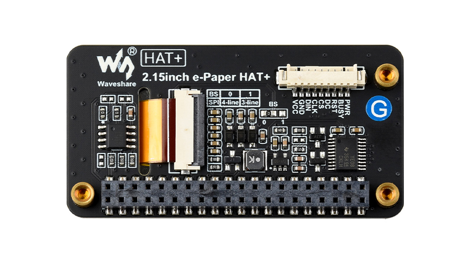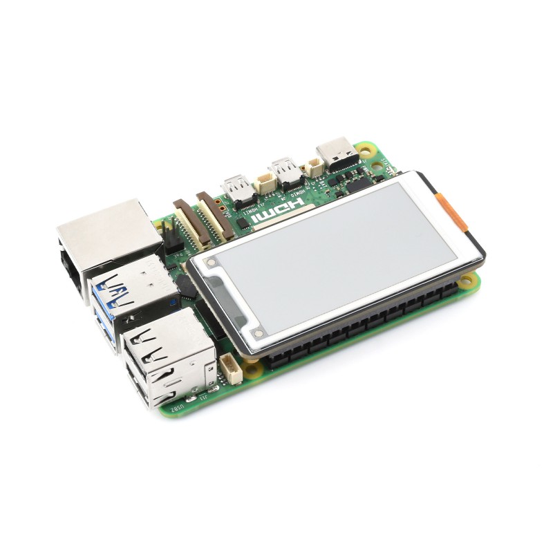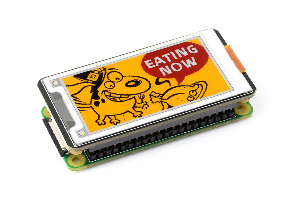 2.15 inch E-paper display for Raspberry Pi. HAT that connects to the 40-pin GPIO header. Resolution 296 × 160 pixels with red, yellow, black and white colors. High-performance e-ink display with integrated driver HAT.