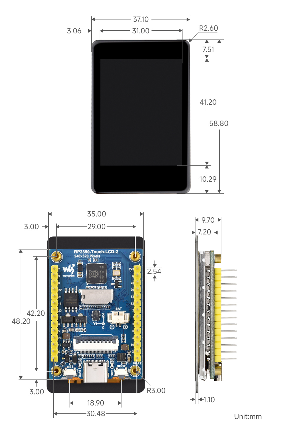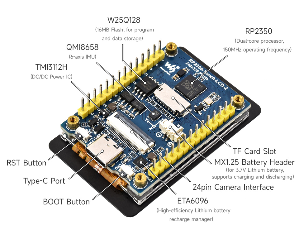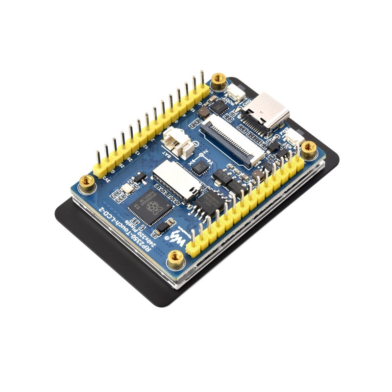 Thanks to support for battery operation, compact form factor, and multiple interfaces, the RP2350 Touch LCD 2 can easily be integrated into both stationary and mobile applications. The board includes pin headers for connection to a breadboard or custom PCB.