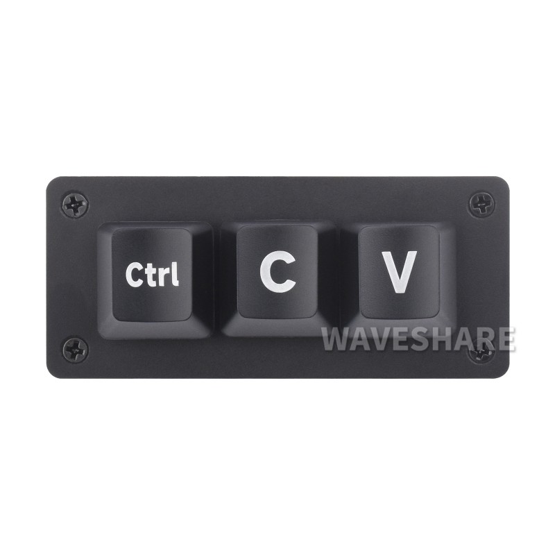 Programmable keyboard with three buttons. Connects via USB-C to a computer (Windows, Mac, Linux) or Raspberry Pi. Supplied with the “Ctrl”, “C”, and “V” buttons pre-mounted and pre-programmed. Three additional buttons with transparent plastic caps are included, allowing you to print and label the buttons with a custom appearance. The buttons are MX Blue type and provide a tactile click when pressed. The keys feature both backlighting and underlighting with individual RGB LEDs, meaning the desired color that lights up when a button is pressed can be programmed.