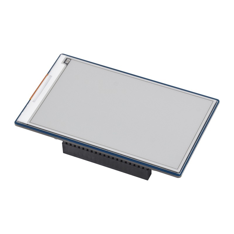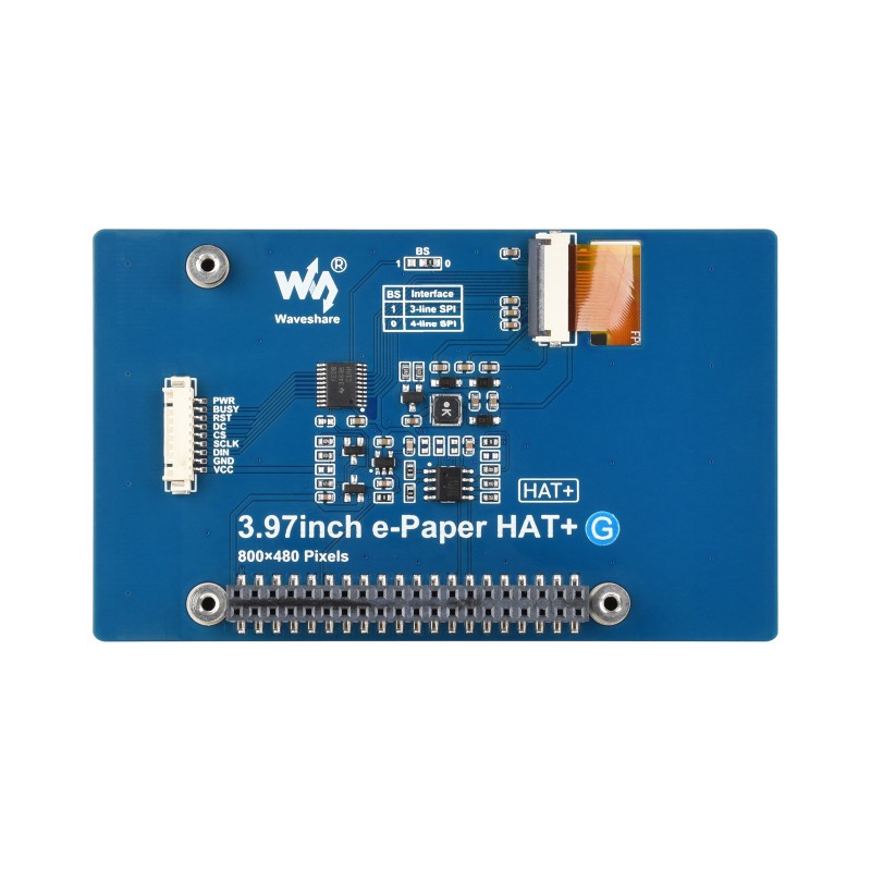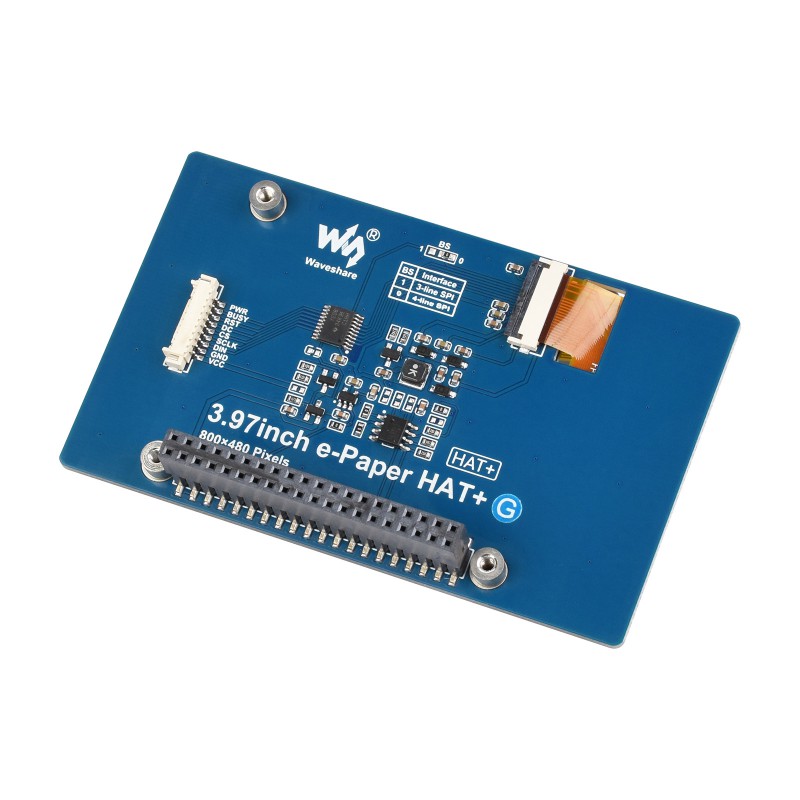 3.97 inch E-paper (e-ink) display for Raspberry Pi. HAT that connects to the 40-pin GPIO header. Resolution 800 × 480 px with red, yellow, black and white colors. High-performance e-ink display with integrated driver HAT.