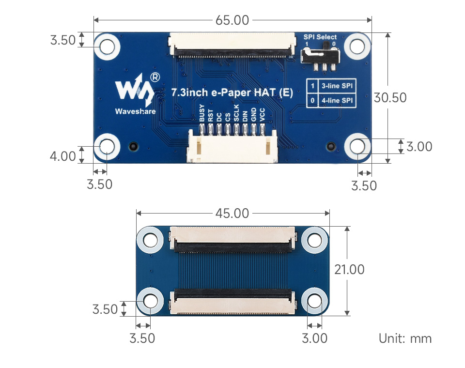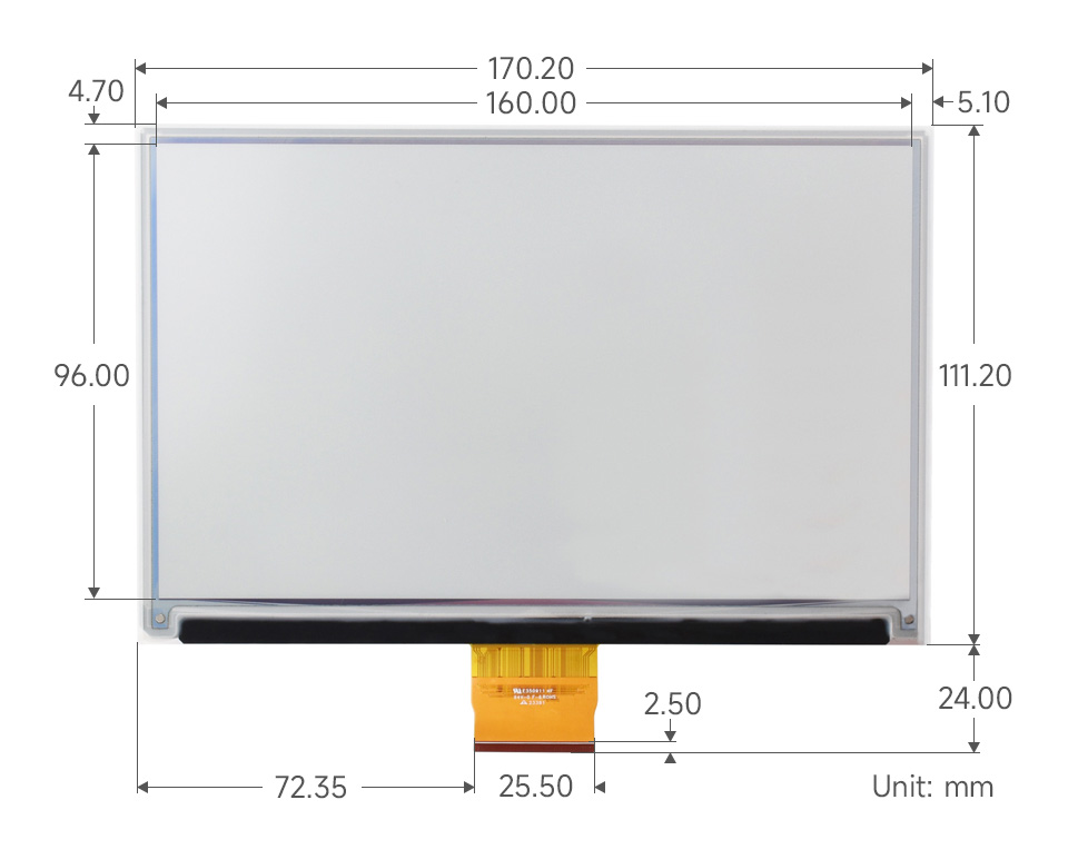 7.3-inch e-paper display (e-ink). Supplied with a HAT module for direct connection to Raspberry Pi. Can also be connected to other microcontrollers via SPI, such as Jetson Nano, Arduino, and ESP32. The display uses E Ink Spectra 6 (E6) full-colour technology, enabling colour display with high contrast and good colour saturation without backlighting. The panel has a resolution of 800×480 pixels and an active display area of 160 × 96 mm. With a viewing angle of more than 170°, the content remains clearly readable over a wide viewing range.
