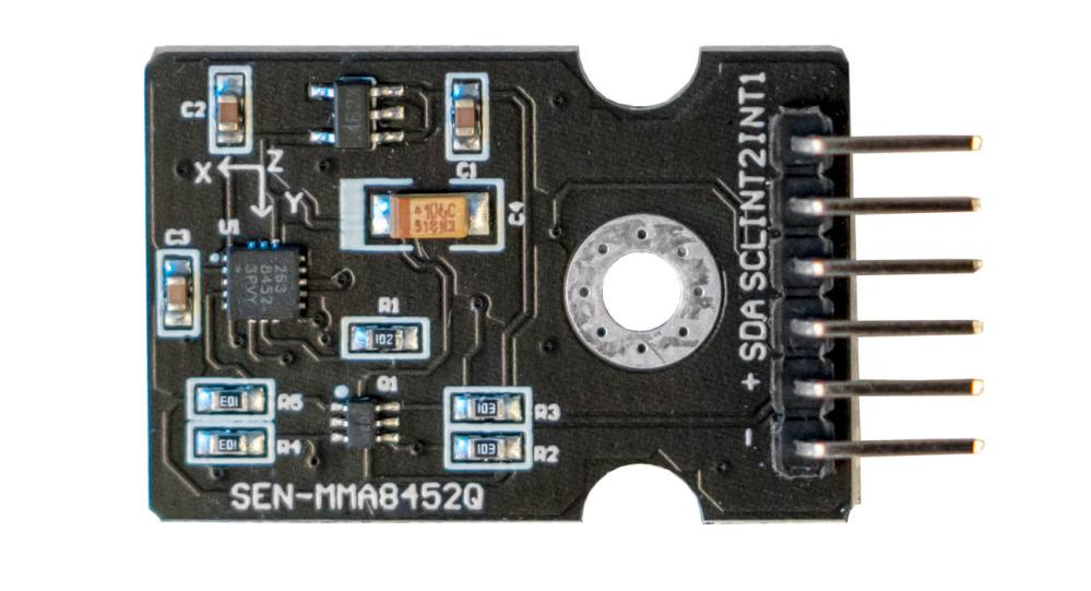 Three-axis accelerometer based on the MMA8452Q IMU sensor. Used in projects where precise motion detection and orientation analysis are required. The sensor communicates via I²C and can be configured with multiple measurement ranges as well as built-in functions for event detection such as free fall, vibration, and tilt. Well suited for robotics, embedded systems, education, and prototyping. Supports adjustable sampling rate and 8- and 12-bit digital output.