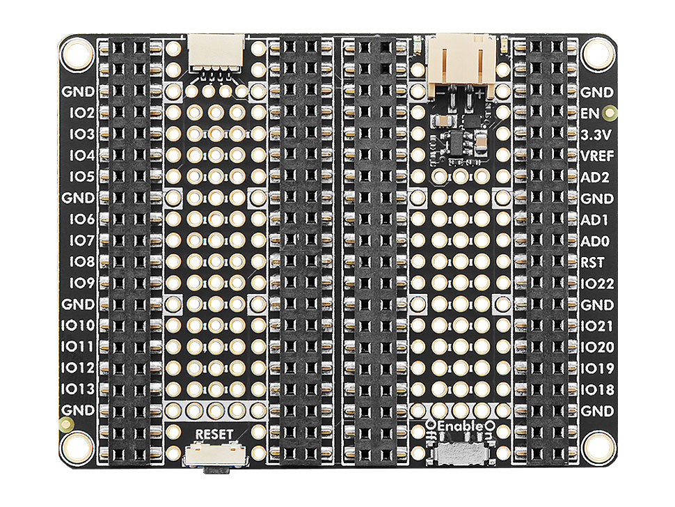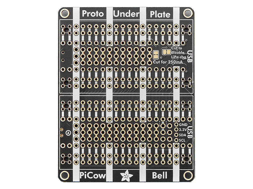 Proto Doubler PiCowBell is a proto board with some nice extra features for Raspberry Pi Pico. The board has sockets for attaching a Pico expansion board beside the Pico, a LiPo charger (250/500mA charge current), a QWIIC connector for external I2C modules, a reset button and lots and lots of holes for your own circuitry.