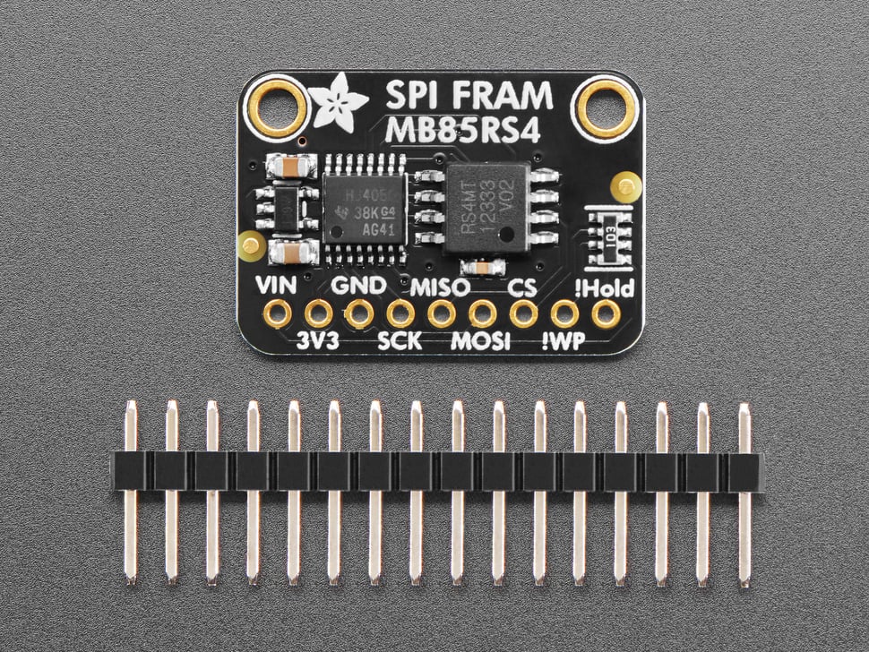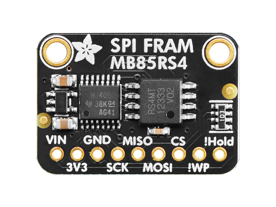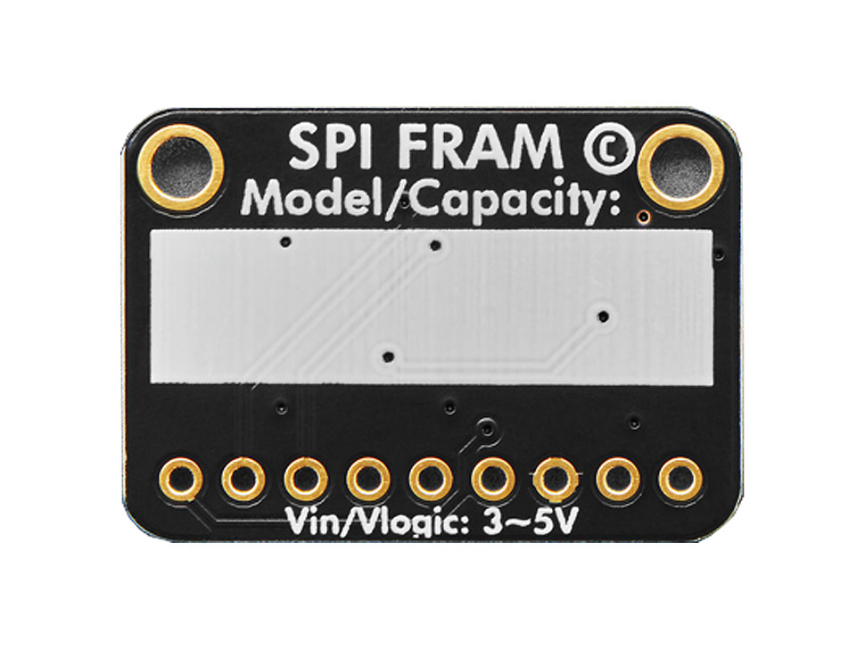 Now, with our SPI FRAM breakout board you can add some FRAM storage to your next DIY project. FRAM allows for a lower power usage and a faster write performance. It's excellent for low-power or inconsistent-power datalogging or data buffering where you want to stream data fast while also keeping the data when there's no power. Unlike Flash or EEPROM there's no pages to worry about. Each byte can be read/written 10,000,000,000,000 times so you don't have to worry too much about wear leveling.