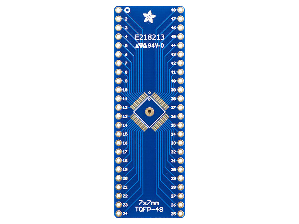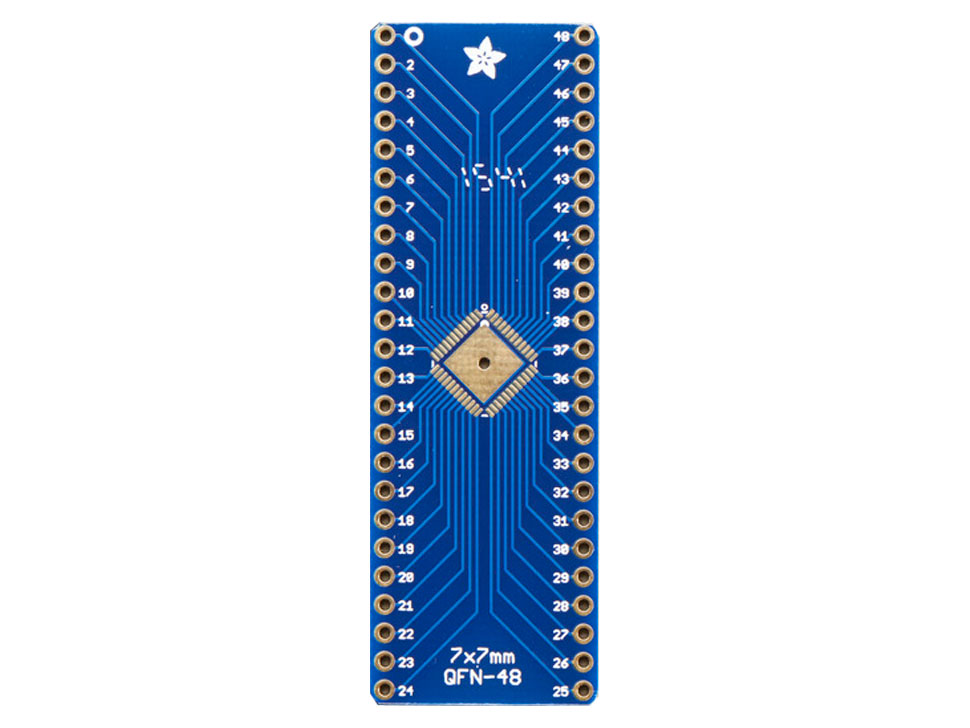 Adapter card for converting a surface mounted QFN-48 or TQFP-48 circuit to through-hole. One side has footprint for QFN (7x7) and the other has footprint for TQFP (7x7).