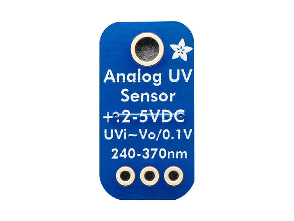 This sensor is much simpler than our Si1145 breakout, it only does one thing and gives an analog voltage output instead of requiring a complicated I2C setup procedure. This makes it better for simple projects. It also has a 'true' UV sensor instead of a calibrated light-sensor. To use, power the sensor and op-amp by connecting V+ to 2.7-5.5VDC and GND to power ground. Then read the analog signal from the OUT pin. The output voltage is: Vo = 4.3 * Diode-Current-in-uA. So if the photocurrent is 1uA (9 mW/cm^2), the output voltage is 4.3V. You can also convert the voltage to UV Index by dividing the output voltage by 0.1V. So if the output voltage is 0.5V, the UV Index is about 5.