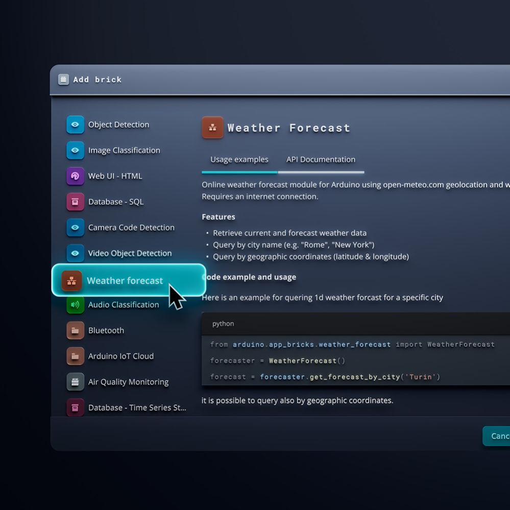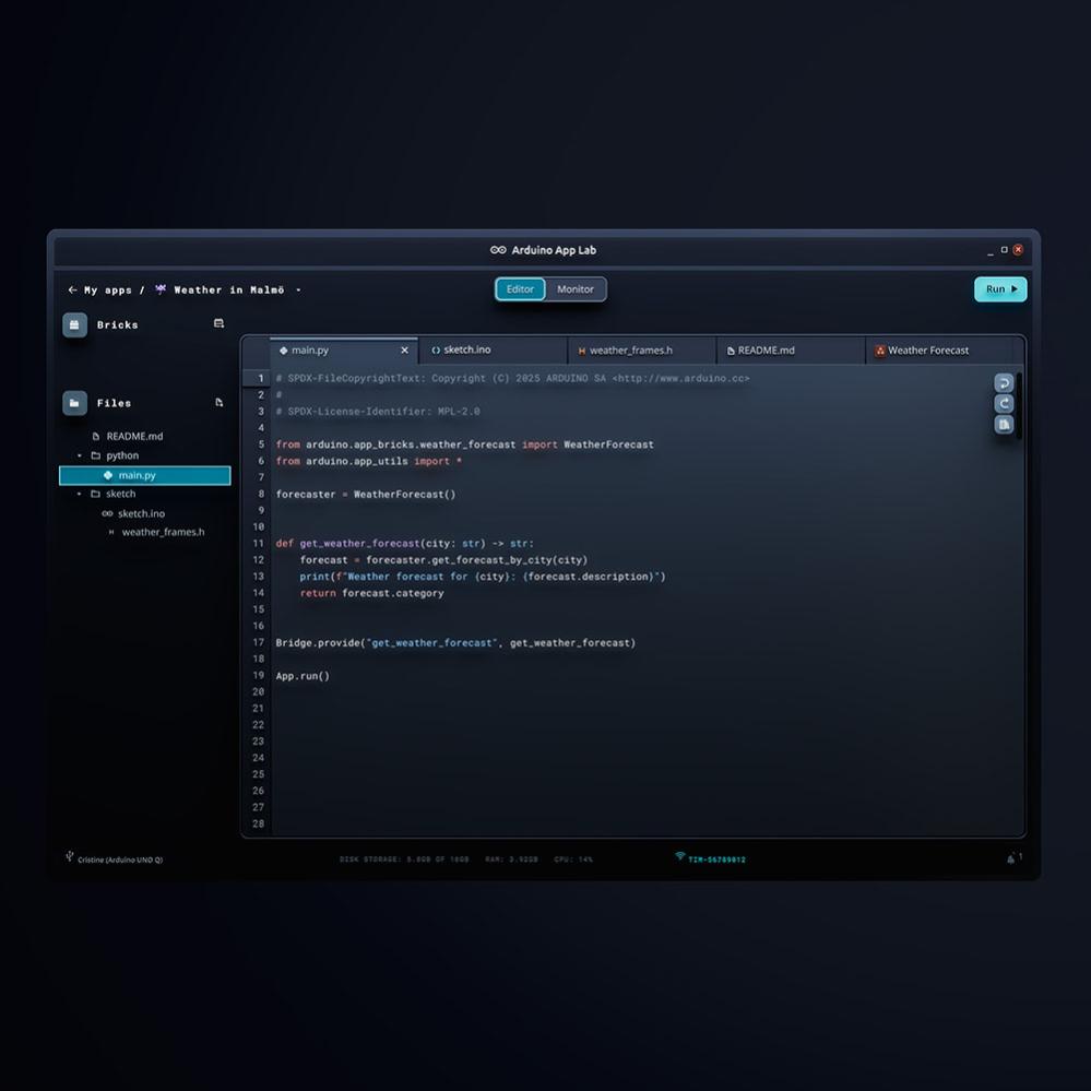 In addition to Arduino IDE and Arduino Cloud, you can get started quickly with ready-to-use examples and AI models via Arduino App Lab.