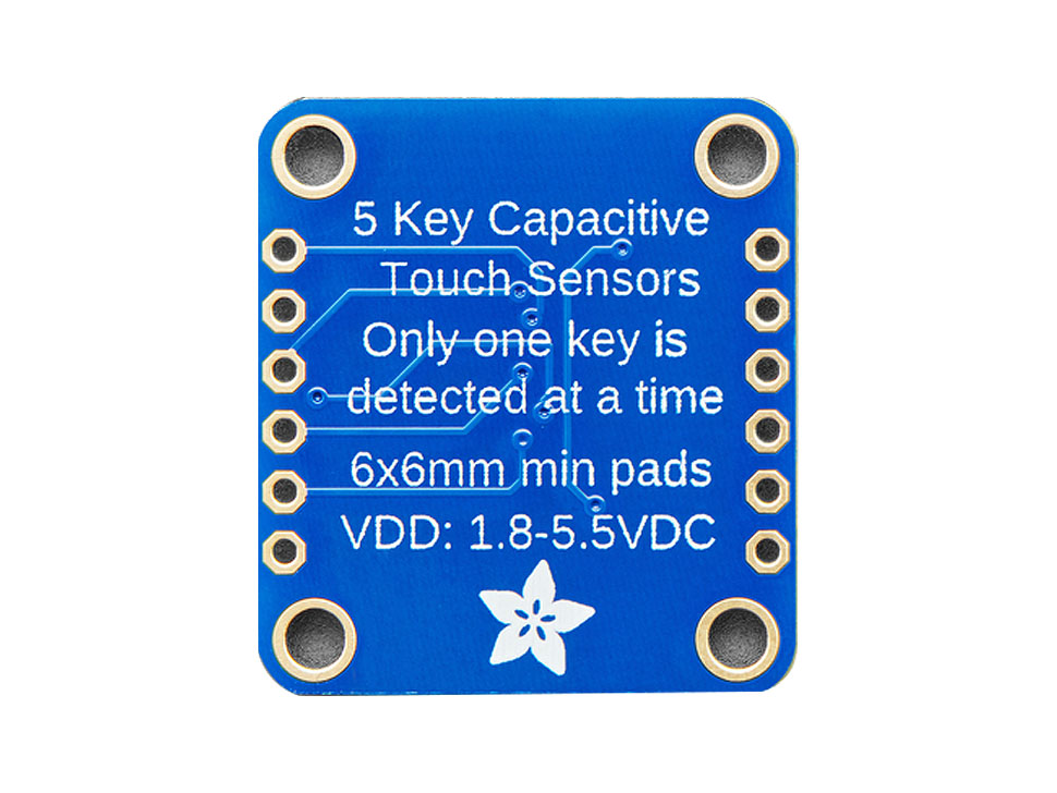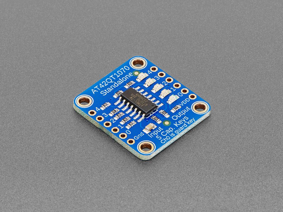 This breakout board is the simplest way to create a project with mutiple capacitive touch sensors. No microcontroller is required here - just power with 1.8 to 5.5VDC and connect up to 5 conductive pads to the 5 left-hand pins. When a capacitive load is detected (e.g. a person touches one of the conductive contacts) the corresponding LED on the right lights up and the output pin goes low. You can use this to update an existing normal-button project where buttons connect to ground when pressed.