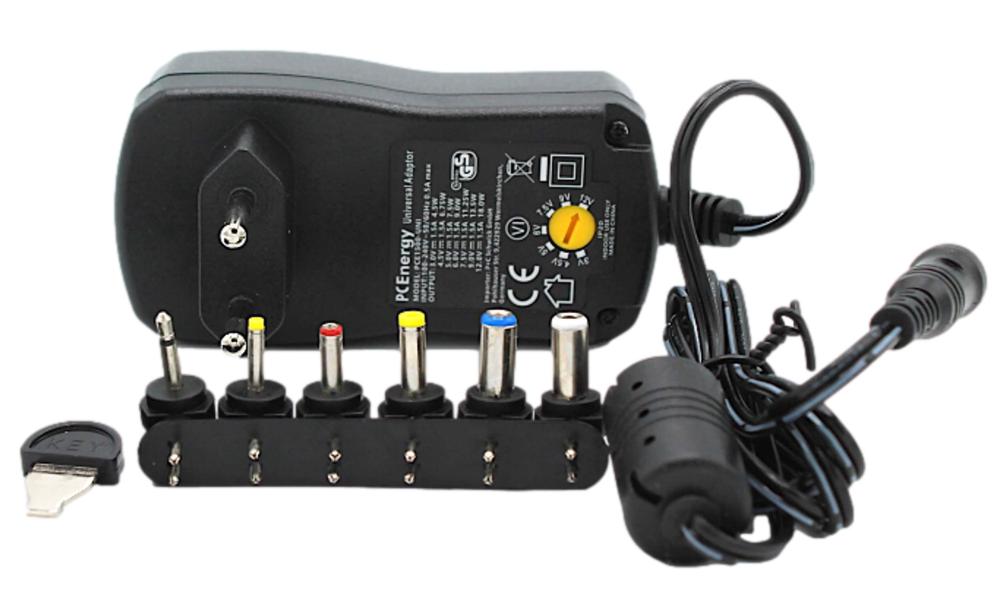 Universal adjustable power adapter 7.2W. Adjustable in 7 steps between 3 and 12 VDC. Replaces an old broken or lost power adapter. Supplied with 6 DC adapter plugs for broad compatibility. The output is protected against short circuit and overcurrent.