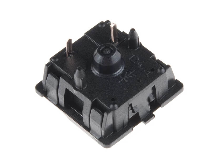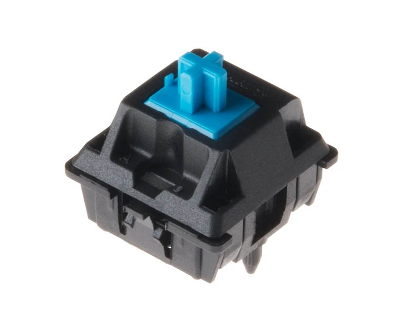 Cherry MX Blue is a mechanical key switch with tactile feedback and a clearly audible click at actuation, intended for use in mechanical keyboards and other input interfaces where both sensitive response and audible confirmation are desirable. The switch incorporates a secondary internal actuation mechanism that reduces the risk of unintended double actuations. MX Blue features a design that allows mounting of a small 3 mm LED for backlighting in keyboard constructions. Manufactured in Germany by Cherry.