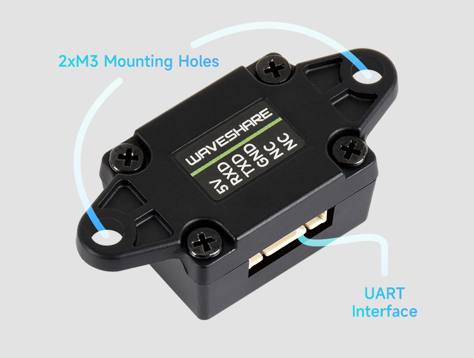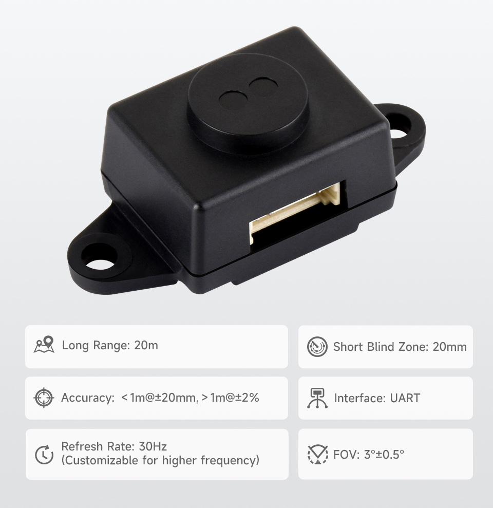 LiDAR-based distance sensor for precise measurement up to approximately 20 meters. The sensor features low power consumption and a high update rate. It is designed according to the ToF principle (Time of Flight) and built around a D-TOF single-point sensor with an integrated microcontroller. The narrow measurement angle enables accurate point measurements without being affected by surrounding objects. Optical algorithms are used for stable, accurate, and sensitive distance detection. Typical applications include precise distance measurement in robotics, autonomous systems, industrial automation, and level detection. The sensor module communicates via UART, simplifying connection to microcontrollers.