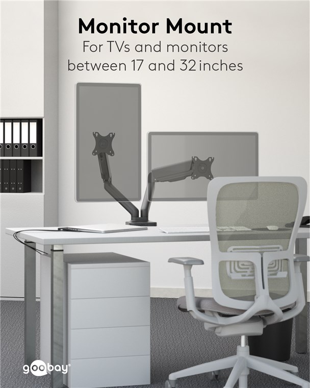 Desk mount with gas spring mechanism for dual monitors. Supports two displays sized 17–32″ (43–81 cm) with a weight of up to 9 kg per monitor. The gas spring mechanism enables smooth and flexible positioning. Installation can be done using a desk clamp or through a drilled hole in the desktop surface. The clamp is designed for desktops with a thickness of 10–83 mm. VESA-compatible with 75×75 or 100×100.