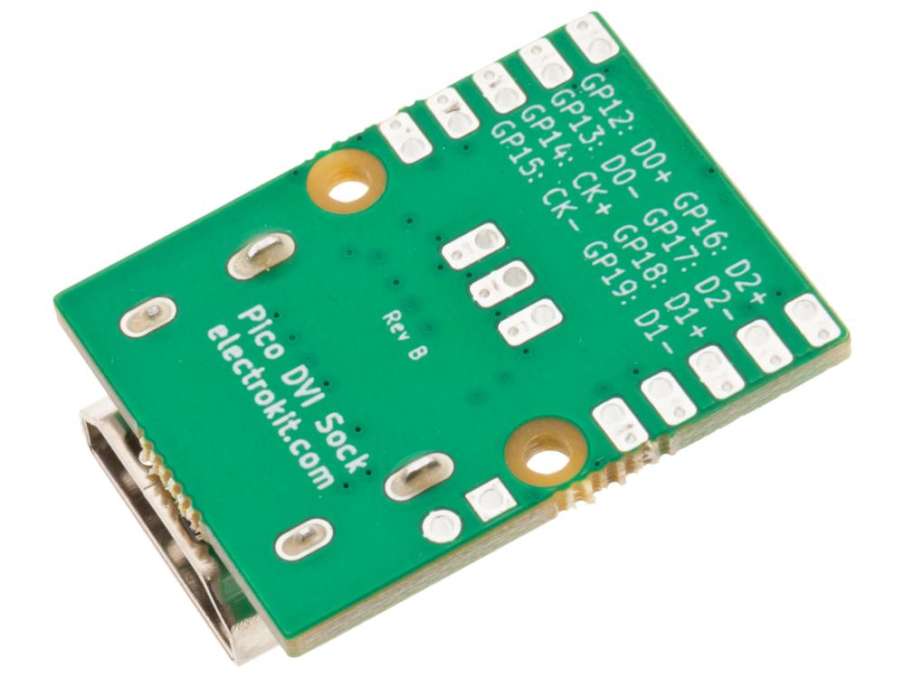 DVI Sock for Raspberry Pi Pico 2 is a compact breakout board that provides digital video output to an HDMI display or monitor. The board functions as a DVI output and connects directly to the underside of the Pico, either via wiring to the GPIO pins or by being soldered in place as a “sock” on the end of the board.