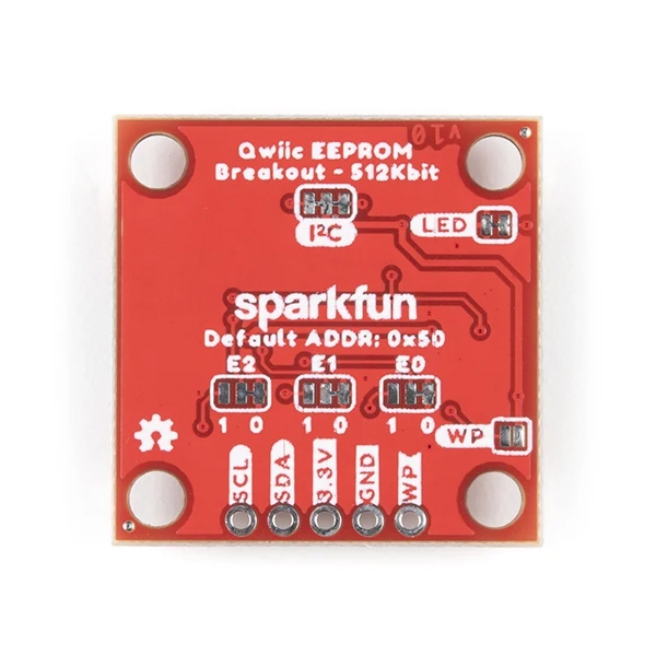 EEPROM Breakout (512 Kbit) with Qwiic connection. Adds non-volatile memory to microcontroller-based systems via I2C. The board is based on the CAT24C512 and provides 512 Kbit (64 kByte) of storage, making it suitable for storing parameters, log data, or user settings that need to be retained after power loss.
