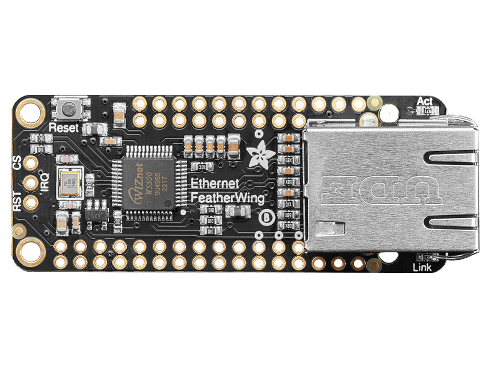 Ethernet is a tried-and-true networking standard. It's supported by every hub and switch, and because there's a physical connection you don't have to noodle around with SSIDs, passwords, authentication schemes or antennas. It works great with any of our Feathers, the WIZ5500 chip communicates over SPI plus a single CS pin. The Arduino Ethernet2 library works great, and within a few seconds after connecting, will do the DHCP setup for you. As a nice extra, the RJ-45 jack has both link and activity lights that will light/blink to let you know the current connection status.
