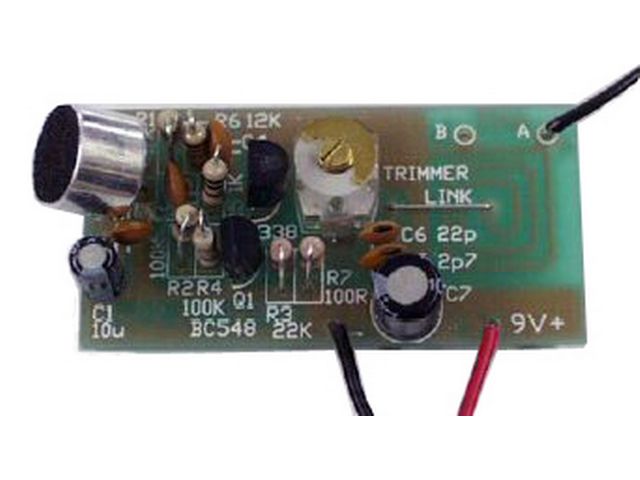 A FM-oscillator that can be used for receiver testing and cable transmissons to an FM-receiver. Tank oscillator coil built into the circuit board. Can be tuned anywhere in FM band.