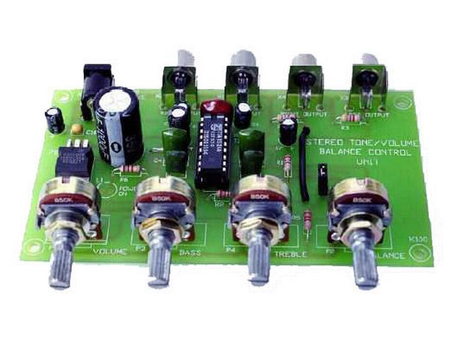Preamplifier for two channels (stereo) with tone control, balance adjustment and loudness control. The kit is built around the IC TDA1524A, which is an integrated amplifier. The amplifier can boost the input signal with up to 20dB and provides control over bass, treble, left/right balance and loudness. Bass and treble can be boosted or attenuated with ±15dB.