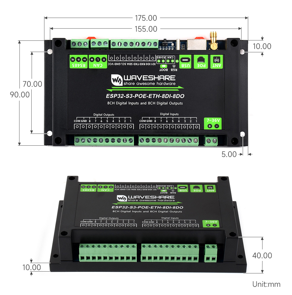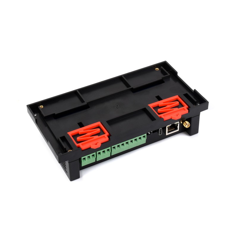 PLC for building and industrial automation. Based on ESP32-S3, providing high processing performance, complex logic handling, network protocols, and wireless communication. It features 2.4 GHz Wi-Fi and Bluetooth LE as well as an Ethernet interface with PoE support. The unit offers 8 isolated digital inputs and 8 isolated digital outputs with optocoupler and digital isolation for improved noise immunity. The digital outputs are NPN open-collector type (max load 500 mA per channel), allowing direct control of smaller loads or interfacing with relays. For external connection to a computer, USB-C is used for both power supply and programming. Multiple communication interfaces are available, including RS485 and CAN, simplifying integration with Modbus networks and CAN bus systems.