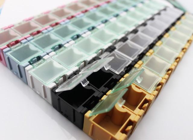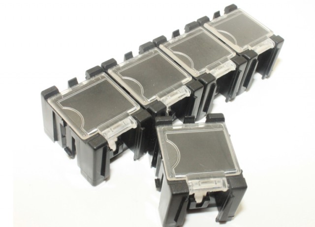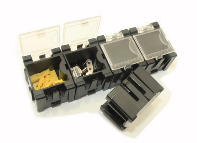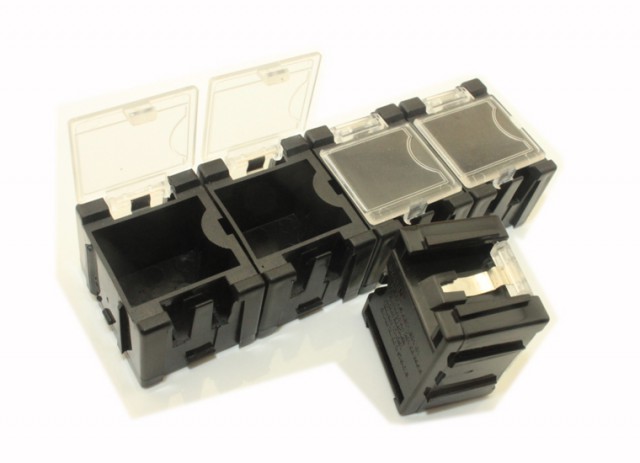 Storage boxes for e.g. SMD components. Modular, the boxes can be combined infinitely. Transparent spring-loaded lid which snaps shut. Set of 5 boxes.