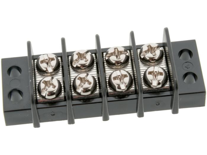 Terminal block for chassis mounting. The block has four poles each with two screw connections. Barriers between poles prevent short-circuits.
