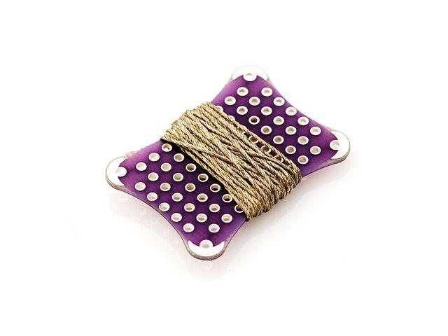 This is dual-purpose bobbin with 10ft of high quality 4-ply conductive thread. Once the thread is gone, the bobbin doubles as a small LilyPad Protoboard. We created this small bobbin to help people get into wearable electronics without the upfront cost of buying an entire spool of thread. 10 feet of thread is enough to get a simple design stitched onto your shirt, backpack or hat.