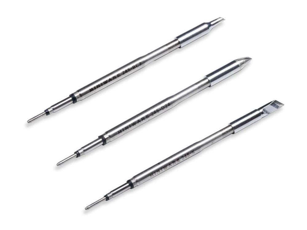 One tip is included, with a knife shaped tip (245-K), The knife shape is very flexible – the thin tip can be used for smaller solder joints where space is limited, while the large flat surface can warm up larger pads quickly.