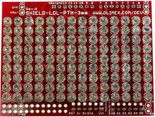 This is Lot-Of-Leds multiplexing LEDs shield with 126 LEDs made in 14x9 matrix. This shield originally was developed by Jimmie P Rodgers and you can find his original project and Arduino libraries here When we saw this shield first time we fall in love with it, it was so simple and nice to play with, especially when we saw how Super-Awesome-Sylvia assembed it :) What we didn't like on the original design was that it uses only 3mm LEDs, so we made another one with 5 mm and 10 mm LEDs and one complete LOL with embedded Arduino called LOL-TEXTILE which is 30x20 cm and can't be attached to your clothing back.
