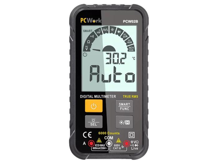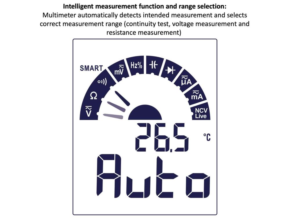 The multimeter is shock-protected with a removable rubber shell. Built-in LED work light. Non-contact voltage indicator for, e.g. checking whether cables are live or finding wiring in walls. Also measures room temperature.
