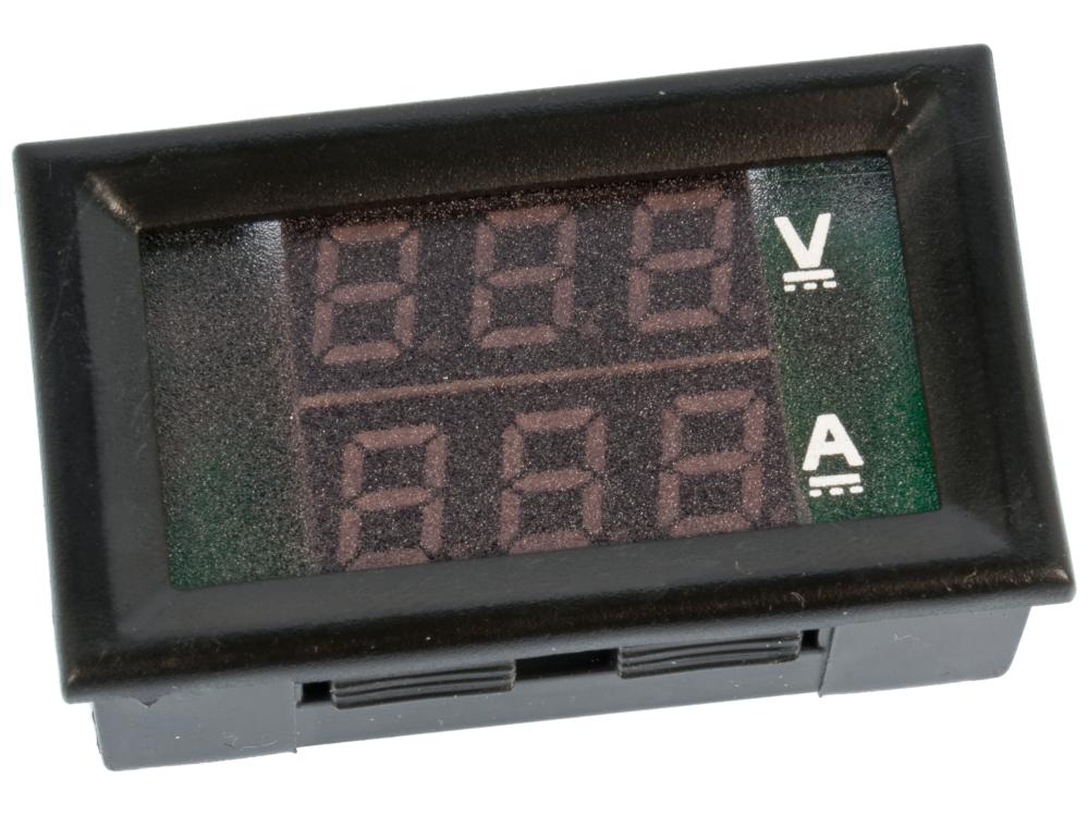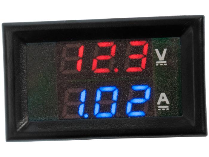 Panel mounted instrument for measuring voltage and current. The instrument is powered with 4.5 - 30V and can measure voltages between 0 and 100VDC and current between 0 and 10A. The instrument has 150mm leads and a frame for panel mounting.
