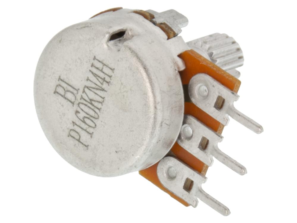 Potentiometer with conductive plastic element. Minimal noise and long life. Through-hole solder pins for circuit board. Right-angled. Knurled 18-tooth shaft.