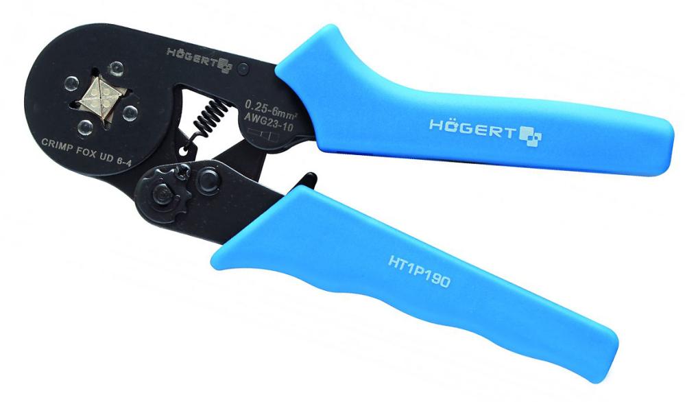 Self-adjusting crimping tool with square crimping for ferrules. With four jaws, the force is evenly distributed around the ferrule. The crimp connection is strong and secure, while the crimping process is faster and easier compared to a regular crimping tool.